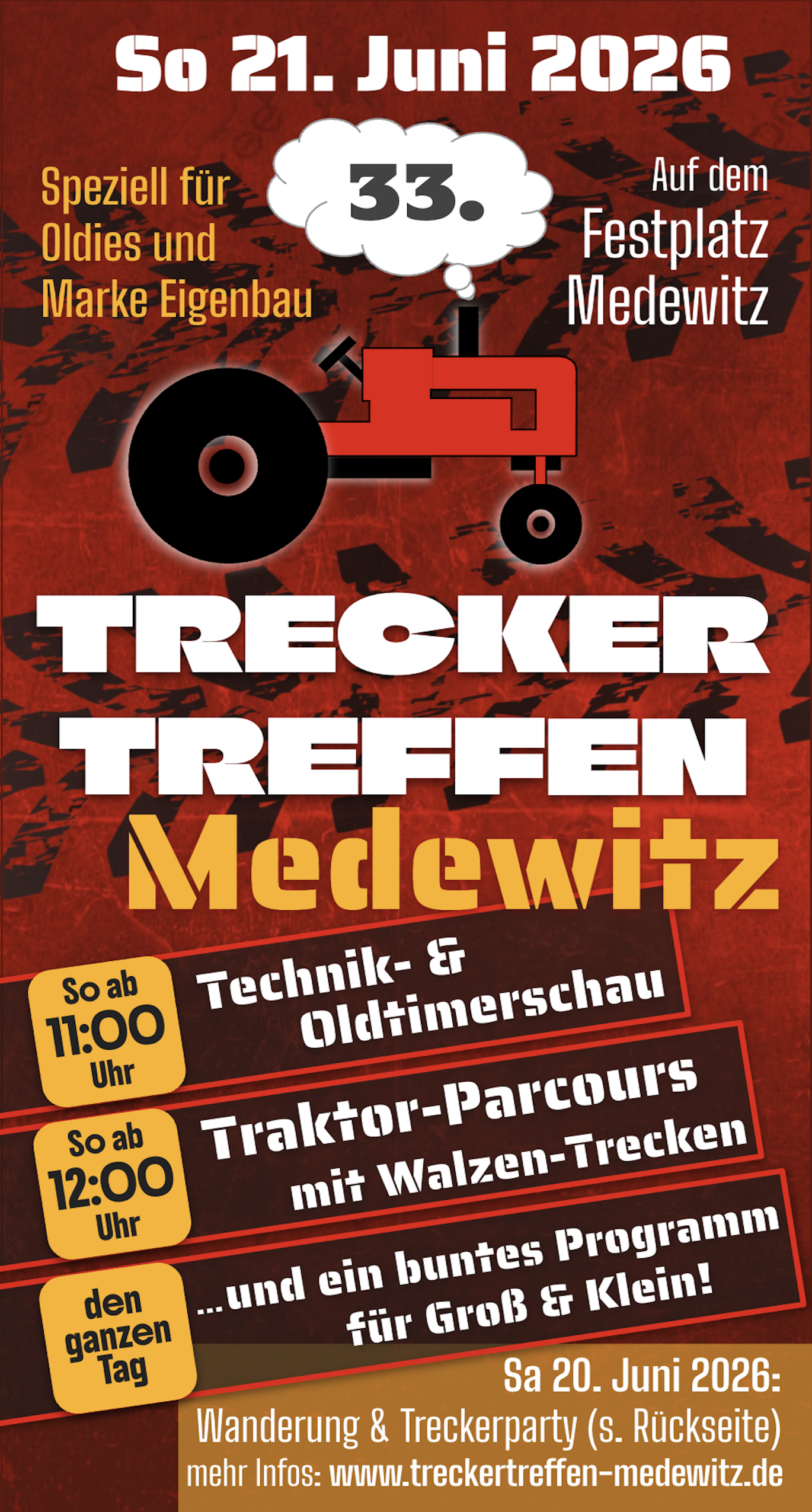 Zum 32. Mal findet das legendäre Treckertreffen für Oldtimer, Eigenbauten und moderne Kraftpakete auf dem Medewitzer Festplatz statt. Es werden zahlreiche Traktoren verschiedenster Bauarten erwartet – ein echtes Highlight für Technikfans und Familien gleichermaßen!